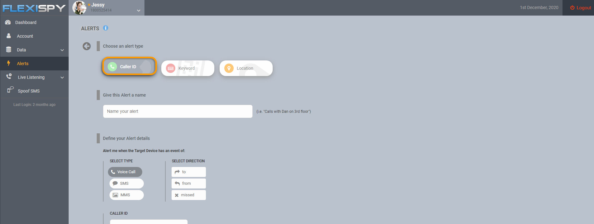 Give the Alert a unique name, choose the Type and Direction (can select all), then enter the phone number you want to watch out for.